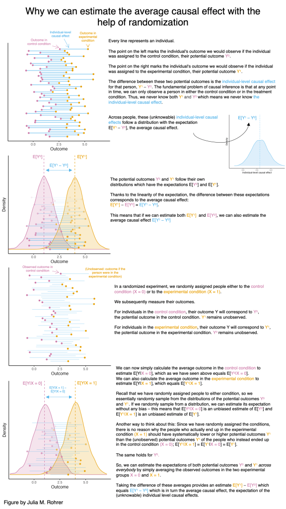 When I gave lectures or talks, I used to struggle with explaining how randomized experiments can actually work. I thus generated a small infographic (link to just the figure) that uses the potential outcomes notation and illustrates how in a randomized experiment the difference in the average outcome between the two groups identifies the average of the individual-level causal effects.