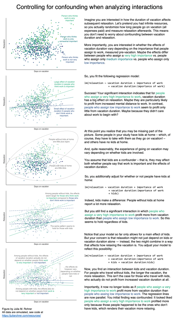 Another thing I occassionally have to explain is how estimates of interactions may be confounded – and how appropriate statistical control requires the confounder to be interacted with the treatment of interest. I made another illustration to drive home this point, here’s a link to just the figure.