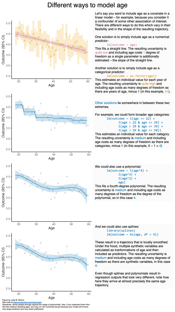 And here’s a figure illustrating different ways to include age (or other predictors) in a model with varying degrees of flexibility. Here’s a link to just the figure and you can download all materials necessary to reproduce it (R-code to generate individual panels, PowerPoint file bringing it all together) here.