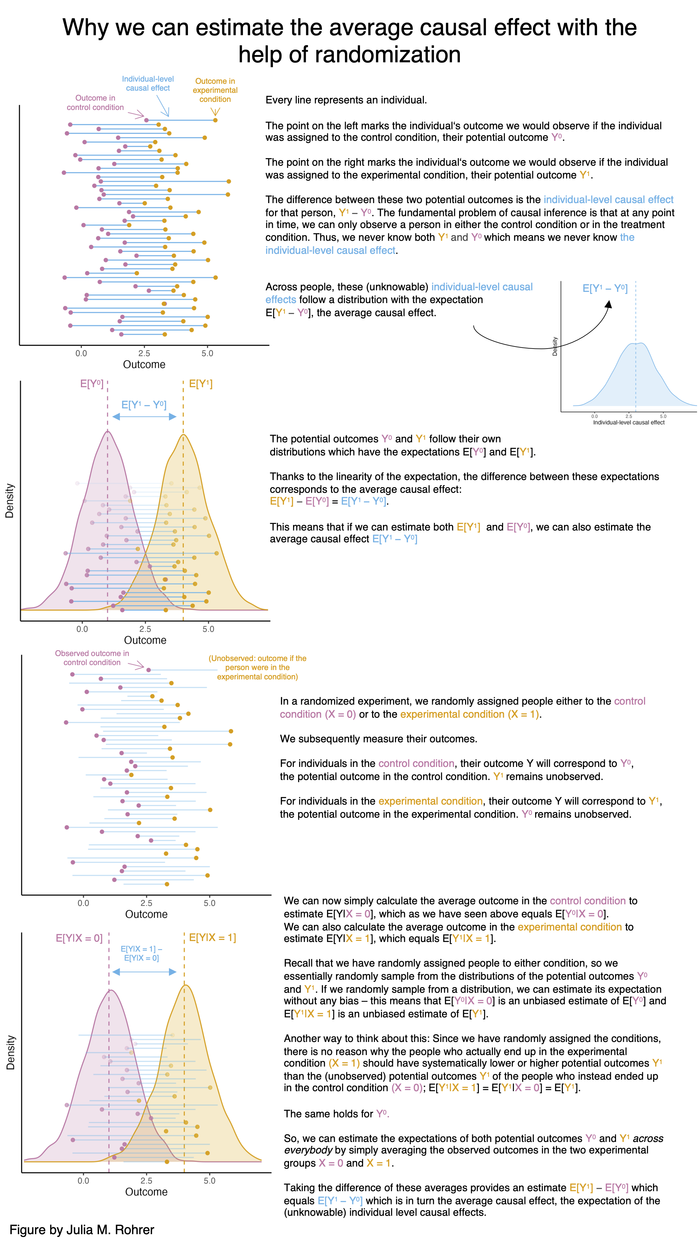 When I gave lectures or talks, I used to struggle with explaining how randomized experiments can actually work. I thus generated a small infographic (link to just the figure) that uses the potential outcomes notation and illustrates how in a randomized experiment the difference in the average outcome between the two groups identifies the average of the individual-level causal effects.