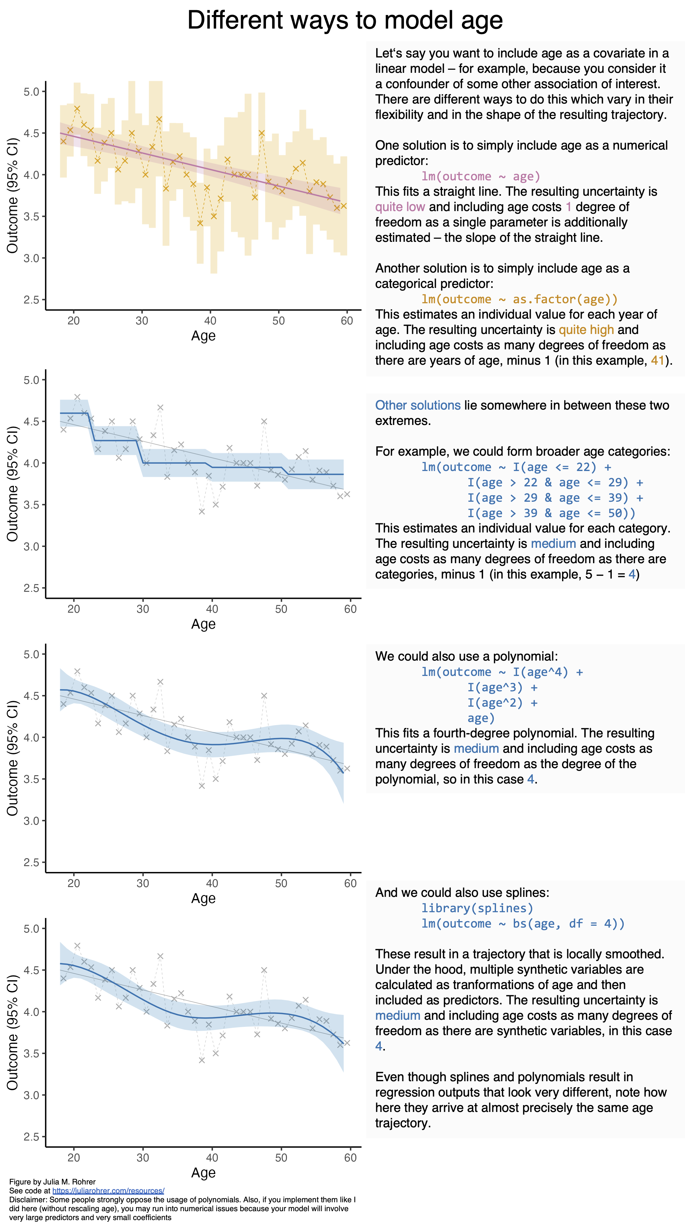 And here’s a figure illustrating different ways to include age (or other predictors) in a model with varying degrees of flexibility. Here’s a link to just the figure and you can download all materials necessary to reproduce it (R-code to generate individual panels, PowerPoint file bringing it all together) here.